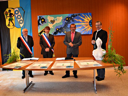 Samedi matin, la cérémonie officielle à Grainville sur odon pour la signature des 20 ans du jumelage réunit les élus, les anciens maires de nos communes et Mme Sylvie Lenourrichel, conseiller général en charge des jumelages. Ce fût l’occasion pour les maires de nos communes de faire connaissance avec le maire d’Unterpleichfeld nouvellement élu. Après les signatures, une poignée de main chaleureuse associant les quatre maires des communes en signe de l’amitié régnant entre nos peuples. Arnaud Potier, Président du jumelage, remit à chacun des maires une plaque commémorative à apposer dans chacune des mairies. De son côté le Maire d’Unterpleichfeld remit à chaque maire les armoiries de sa ville. L’année 2014 étant placée sous le signe du cheval, un spectacle fut proposé à nos hôtes par le centre équestre de Cheux. En soirée, une soirée cabaret fut organisée par l’ensemble du bureau du jumelage et la participation de nombreux bénévoles de nos communes.